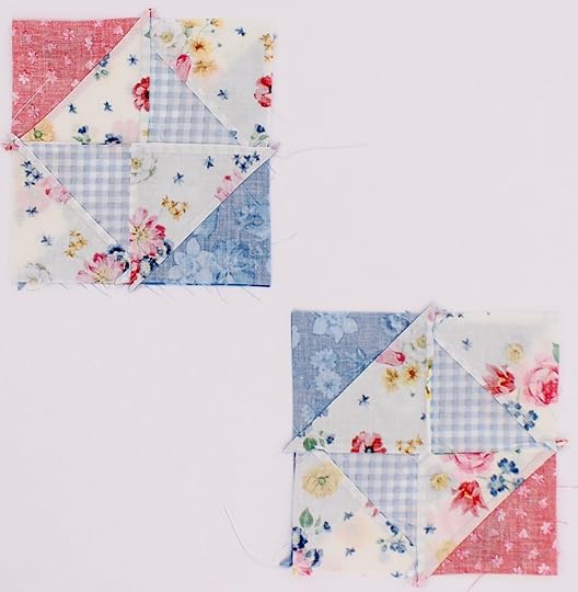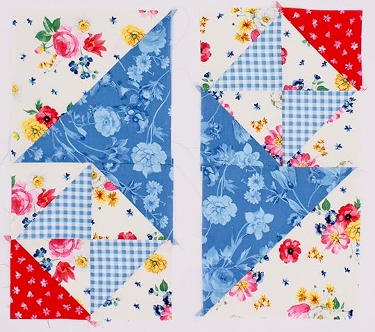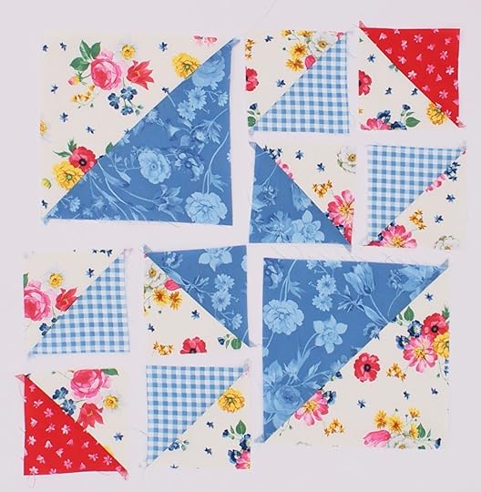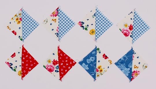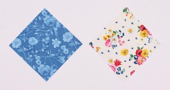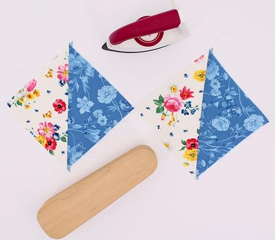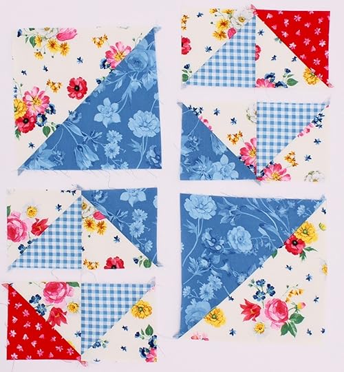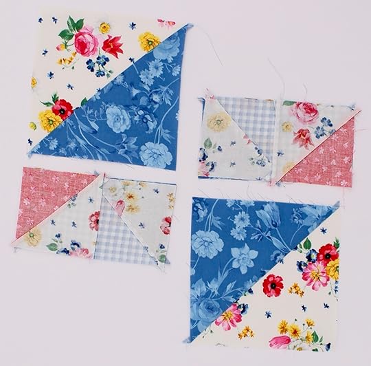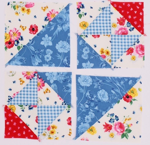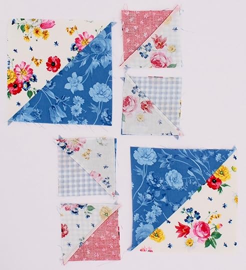 Create four 1/2-square triangle blocks of Afternoon Picnic Cream Floral and Afternoon Picnic Blue Gingham