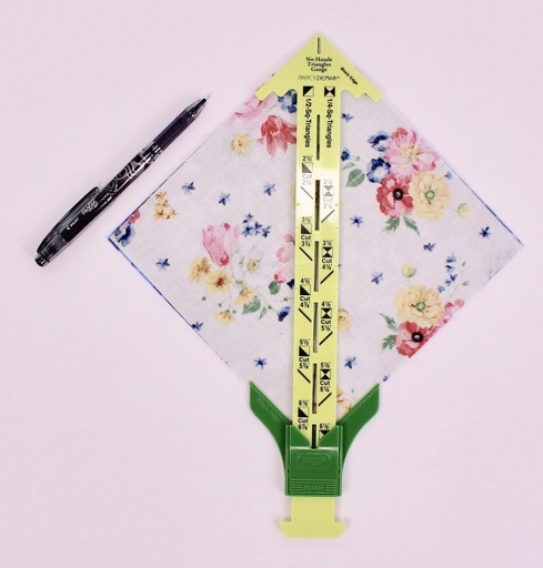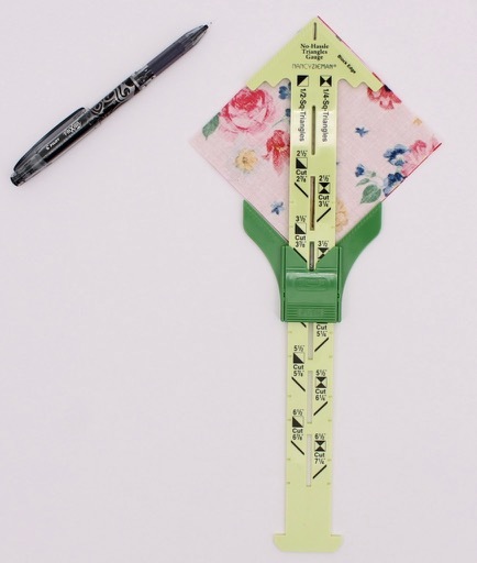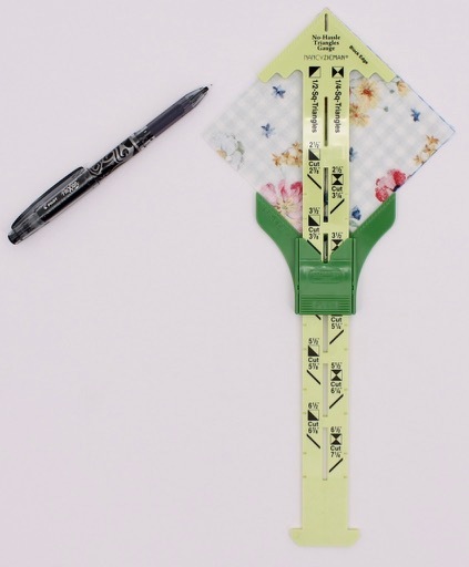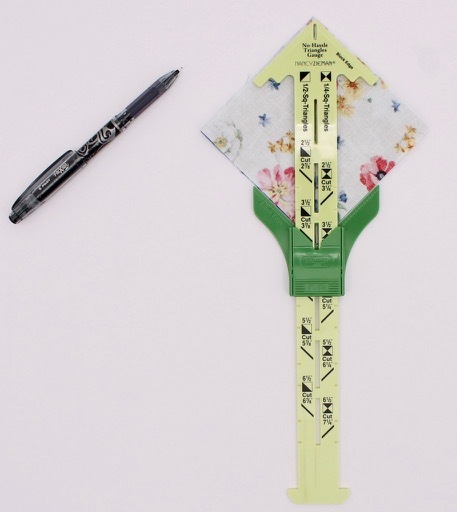 For greatest accuracy, use a No-Hassle Triangle Gauge . The left side of the gauge is designed to create the 3-1/2″ HST blocks.