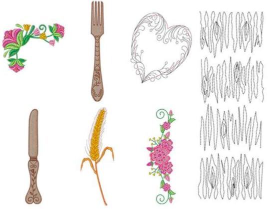 The Farmhouse Collection—Sentiments, “Gather” and “Grateful” includes 10 embroidery designs (sized to fit 5″ x 7″ hoops) including two floral motifs, fork, knife, wheat sprig, four woodgrain quilting designs, and a heart motif to embellish your fabric panels in any fashion you’d like!