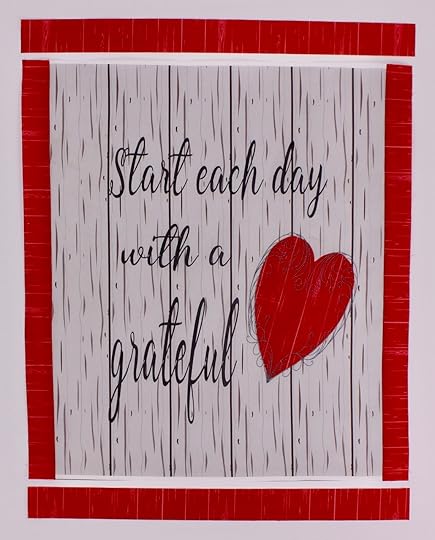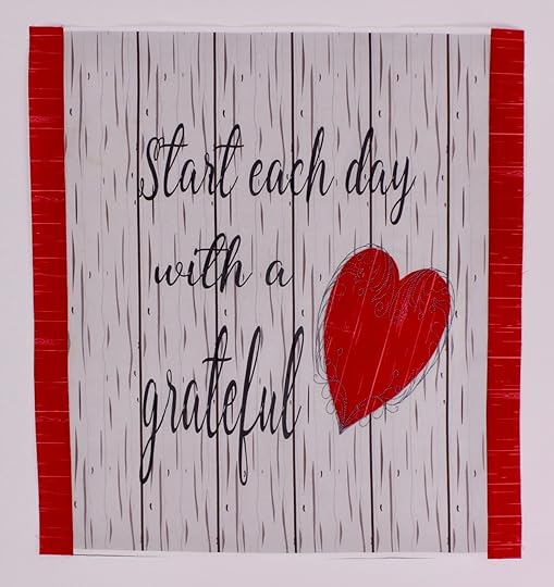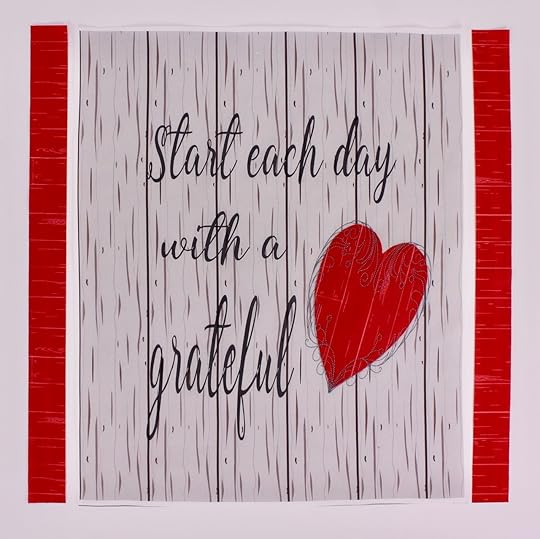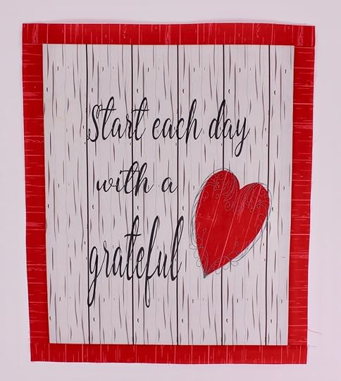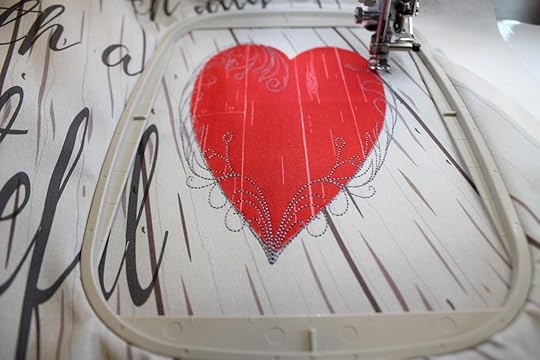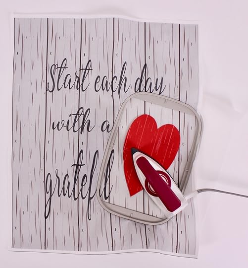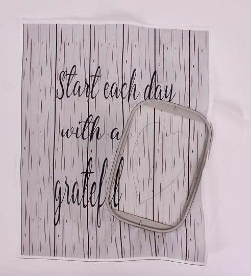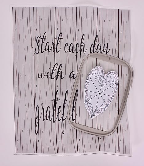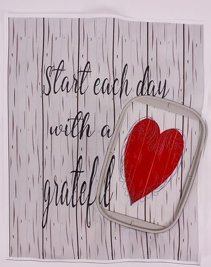 Print, cut out, and place the Grateful Heart paper template on the pre-printed Farmhouse “Grateful” fabric panel . “Nest” the heart embroidery placement close to the printed text. Center template within hoop. Attach hoop to machine. Float a piece of tear-away stabilizer under the hoop. Align the needle with the template’s crosshair. Verify the template is square in the hoop and remove the template. Stitch thread color two, the placement guide.