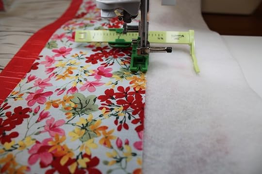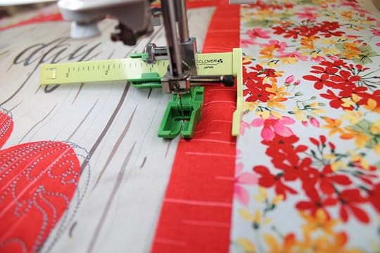 We used NZP’s Ultimate Quilt ’n Stitch Presser Foot—from Clover to “stitch in the ditch” and machine quilt layers together. This all-new presser foot features a built in stitch alignment ruler for guiding rows of parallel stitching. We set the alignment ruler at 1″—to guide along the inner border!