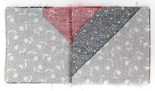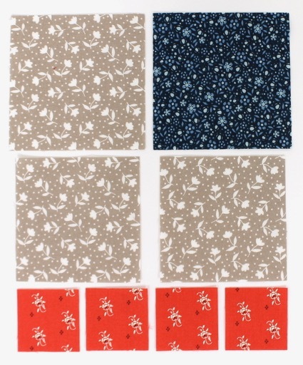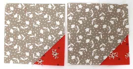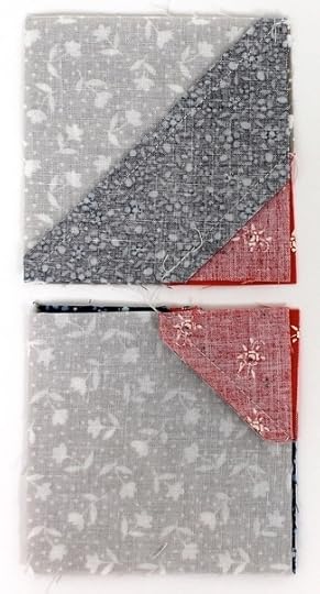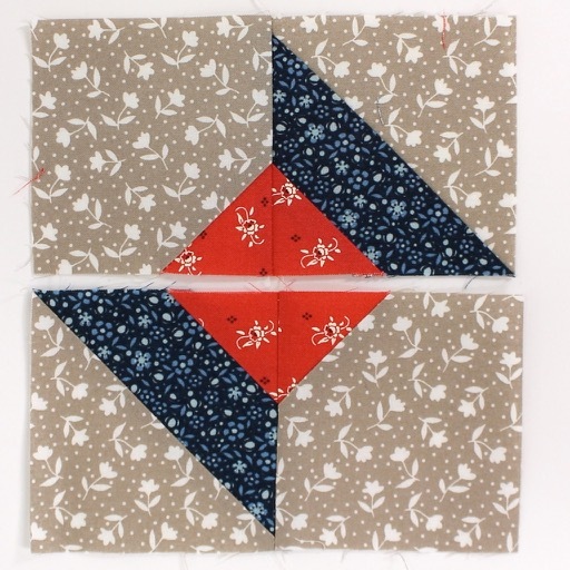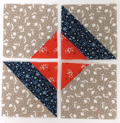 1. Create two 1/2-square triangle blocks from A-tan and B-navy fabric.