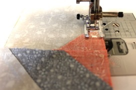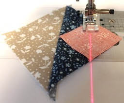PressLayer Fabric C on lower corner of Fabric B right sides together, aligning side edges. Draw a diagonal line from corner to corner on the wrong side of Fabric C. Or, use your straight-line laser function on your Baby Lock sewing machine. Stitch on the marking.