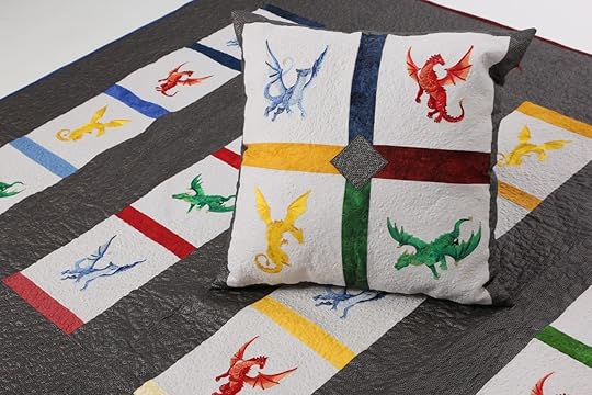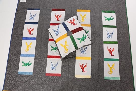 The four books each feature a solid color (blue, red, yellow, and green). Morgan knew she wanted to include that idea in her quilt. The goal was to represent the book colors and select coordinating fabrics. Morgan wanted to embroider the quilt blocks to represent the dragons. She looked on embroidery design websites to find just the right designs. She found the dragon embroidery designs through Amazing Designs Dragon’s Lair, and her mom purchased the embroidery collection for her. Morgan did not realize at the time, but she had an unintentional goal of learning about embroidery stabilizers to create the dragon blocks. This goal took Morgn seven hours to complete.