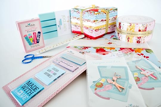 Riley Blake Fabrics/Penny Rose fabrics, Farmhouse Floral Fat Quarter Assortment, Farmhouse Floral 10” stacker, Farmhouse Floral 5” stacker, Two Riley Blake Designs enamel pins, One Ruler Pal, One package of Sewing Mends the Soul bandages, One package of Riley Blake Designs woven labels, One pair of Blue Kisses patterned embroidery scissors and One My Mind’s Eye printed Emery Board. A $150 value