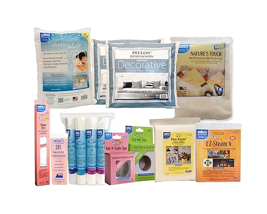 Pellon Bundle, E—80/20 Cotton/Polyester Batting With Scrim—Needle Punched: 1 Queen Size Package 90” x 108”, 2DPI1818—Decorative Pillow Inserts: Twin Pack 18” x 18”, PLOFT16—Perfect Loft Cluster Fiber: 1 Bag 16 Ounces, EMBS4—Embroidery Sampler Pack: 4 Rolls 12” x 5 yds, EZ25S—EZ Steam II-Sided: 1 Bag 5 Sheets of 12” x 9”, FF78F1—Flex-Foam 1 Sided Fusible: 1 Bag 20” x 60”, 180T110—Knit-N-Stable Tape: 1 Package 1” x 10 yds, SF101—Shape-Flex: 1 Package 15” x 2 yds, 281—Woven Stretch Fusible: 1 Package 20” x 1 yd and ST-EK150-30—Easy-Knit Tape: 1 Package 1.5” x 30 yds. A $136 value