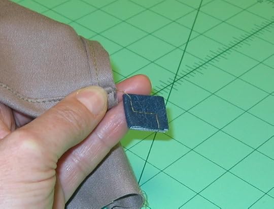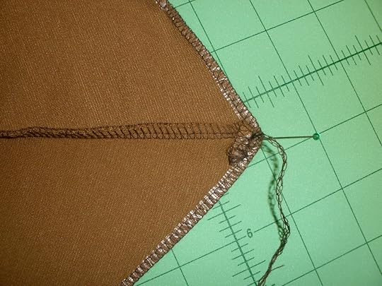 Serge gussets, trimming off excess fabric. Repeat for lining fabric.