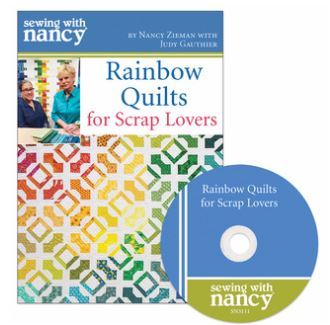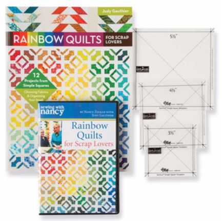 You’ll feel like you’ve taken a trip over the rainbow with scrap-friendly quilt designs, using techniques Nancy called remarkable because, “Not a scrap goes to waste.” Book includes clever tips for organizing your scraps and assembling quilts, along with 12 colorful patterns. Kit includes book, Fast2Cut Simple Squares Template, and Sewing With Nancy DVD.