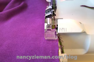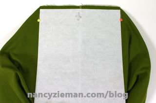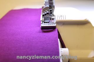 To keep the knit from stretching, serge over precut strips of wash-away stabilizer. Place the strips on the wrong side of the fabric and then serge. After serging, tear away the excess stabilizer. Presto, no stretching. (The stabilizer is what you see, under the stitches, on the wrong side of the fabric in the photos below.)
