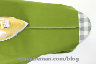 To prevent the serged edge from leaving an impression on the right side of the fabric, press seam over a sleeve board or dowel.