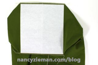 Remove the paper backing; then press the hem to the wrong side–at the edge of the tape. The fusible webbing provides extra stability and shaping.