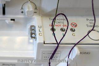 Insert Madeira Mouline, 100% Cotton, Six-Strand Floss into the upper and lower loopers.
