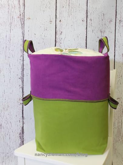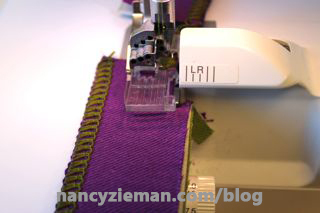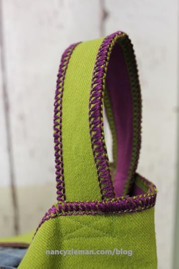 Decorative threads in the upper and lower loopers creates a beautiful finished edge for the tote top and handles.
