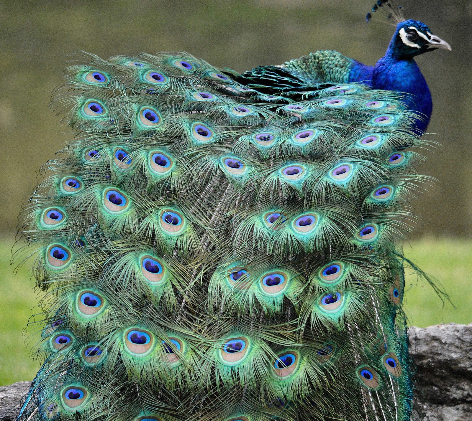 Peacock (Pavo cristatus), wandering freely at the Bronx Zoo.