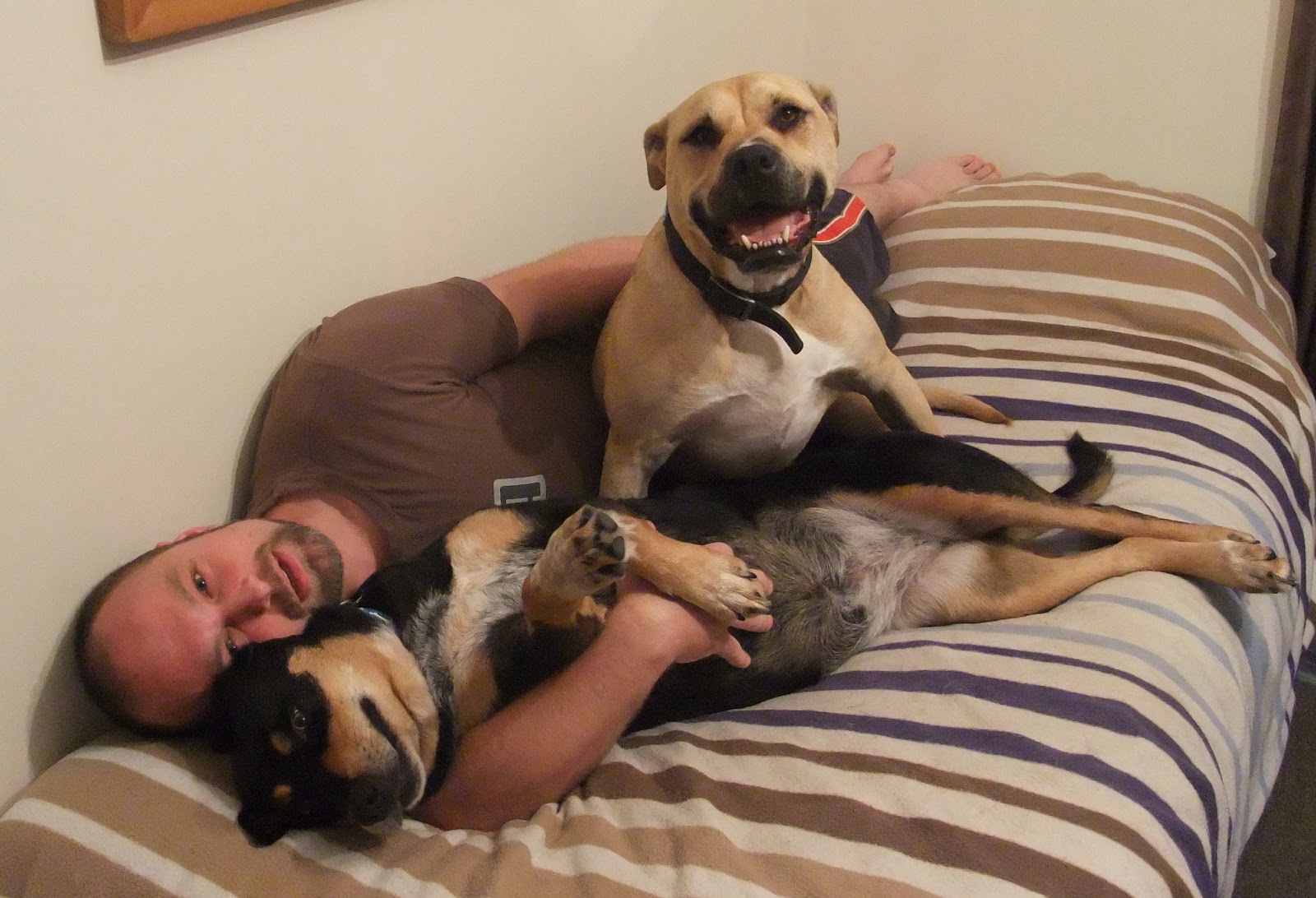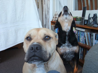 I can't stop crying. We had to have our beautiful boy put down today. The short and skinny is that he was getting more aggressive towards males, and other dogs. Then last week he deliberately climbed into our neighbors yard. Our neighbors whom have two French Mastiffs. Otis was only 36kg compared to two dogs that I'd hazard were around 50kg each. You may remember he fell into their yard once last year. They only had the one dog at the time and he still got a hiding from that. That however was an accident and last week's one was intentional. We know because he had to rip down a lot of wire mesh and other building materials to get to them. He also had to squeeze through a bunch of spiky trees. In short, he was damn determined to do it.We patched him up and Glenn rebuilt the section of fence and added to it. He only stopped limping on Saturday. Then Glenn rang me at work today to say an animal ranger had found him and he needed urgent medical attention. The ranger also said he was too aggressive for her to get close. So we made the heart breaking, but necessary decision to have him put to sleep. We couldn't protect him from himself any more, and we couldn't risk anyone else getting hurt.It just hurts so much. Otherwise, he was the perfect dog. Always wanting cuddles and following me everywhere for more cuddles. Snuggling next to you at any opportunity. He loved popping balloons and shredding the ends of toilets rolls. He still did his puppy run when you got home and his excited twirl before you fed him. He loved going up the bush and pretending he was a tough bush dog (even though he cried when he got lost). He adored our niece and nephew, and any kids for that matter, and I'll never forget the time they camped out in our lounge. Both dogs took turns watching over the kids (I got up to check on them at 2am ;p). He did the worst farts - period - and had the hardest head known (made me see stars on more than one occasion). His whip like tail drew tears when it caught you across the nose and he never, ever, stopped wagging it. Even when we took him to the vet that last, awful time.I wish so much that we hadn't had to do it. But part of me knew last week when he did it, that this was a possible outcome. His sister is lying beside me, silent for once. We know she knows. I can only be so grateful we had such a fantastic 7+ years with him. He was such a beautiful, cheerful and happy dog. I'm gonna miss him so much.