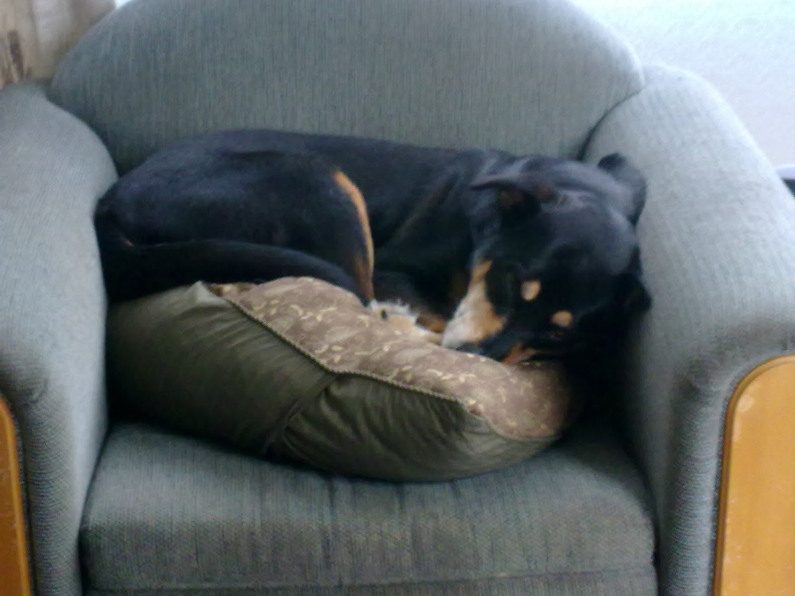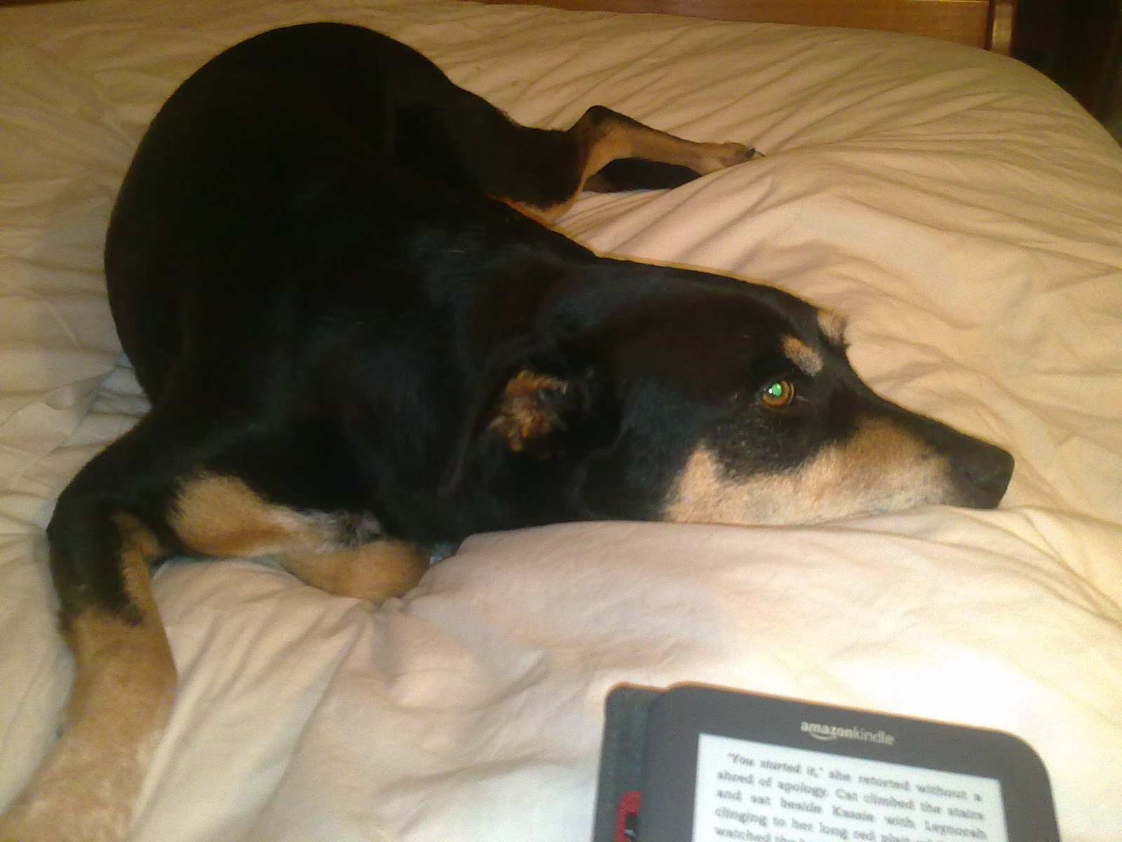 (Stealing my seat)Onto the bedtime drama!Every evening Sable ditches our company in lieu of hanging out on my seat in the conservatory. When bedtime comes around I head on in there and call her out, ushering her to my writing room, where she and Griffon (the cat) sleep. Normally it’s an easy call, and she’s up and at my side. Lately however this hasn’t happened. I think it may be due to when I was sick and she played being ‘sick’ and slept on the bed with me till Glenn came in. Apparently the three-seater couch with the comfy, fleecy dog bed on top isn’t cutting it anymore…The routine now goes like this.‘Sable, come!’ —Dog doesn’t budge.‘Come on, bedtime!’ —Nope. Still not budging.‘Sable, COME!’ —Not happening, not even a flicker.At which point I grumble, stomp over to the seat and pry her reluctant body from it onto the floor.And this is where she gets sneaky.The moment her feet hit the floor she dashes for the dog bed in the conservatory (where she’s actually meant to be—rather than on my seat) and drops. Goes fully, ragdoll floppy. Another bunch of growled orders from me get completely ignored. With much grumbling I reach down and haul the heavy ass up (25 kilos of unrepentant dog) and sort of half carry/half drag her out the room into the hallway. Usually at this point she very begrudgingly gathers to her feet.Then fervently looks for an escape.If I haven’t shut the door to the lounge, bedroom, and any room in the house other than my room, she promptly dashes through the open door and repeats the ragdoll routine. Accompanied by a strangled shriek of frustration from me.Then when I do finally get her into my room, she refuses to climb on her bed. Instead she flops to the floor with a long suffering sigh and a pointed look that plainly says ‘animal abuser’.