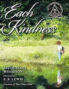 I brought a book to share. It’s called Each Kindness, and it’s by Jacqueline Woodson and illustrated by E.B. Lewis. You may remember that Jacqueline Woodson has come to speak at our church before. She wrote Brown Girl Dreaming and she spent some of her growing up years just a mile or so from our church!