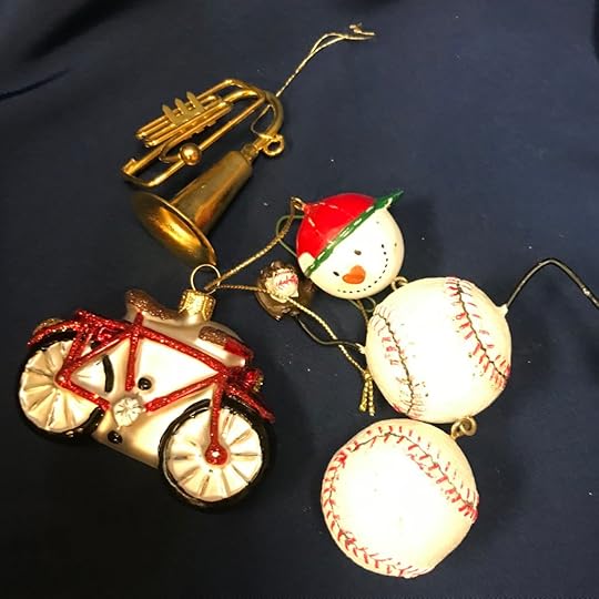 Good morning, girls and boys! I was looking at ornaments on my Christmas tree and I thought I’d show some to you. There’s a baseball ornament of Sam’s, reminds me of all those games he played in. There’s a bike ornament, a tuba from the time Sam played the tuba and there’s a laptop, from a year when I was working really hard on writing a book. I look at all these and I think of a lot of practicing! Baseball, tuba, riding a bike, writing stories. When we practice, we get better at what we’re practicing!