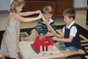 One thing that the Godly Play script doesn’t highlight which you may want to include is the idea that all the people of God were invited to give something of their own to creating the tent of meeting–not just jewelry or fabric or wood, but their own craftsmanship. It was created by the people of God, for God.