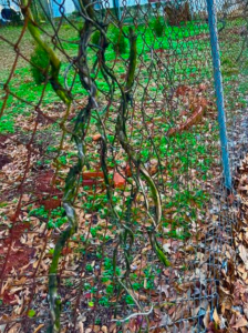 I walk by this fence at least once a day and see the old vines hanging there, long dead but still woven into the links, cut off at the top and bottom. I don’t know what kind of vine it used to be, but man, that thing was hardy! It flat refuses to let go! I hope my neighbors leave it there. It’s kind of a wonder.