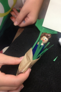 1. Children can recreate the Moses in the Reeds scene, as shown here. (Scroll down to the part showing Moses in an Egg Carton Cup) Children can make their own basket and baby Moses using an a cup cut from an egg carton or paper bag- and whatever they like to make Moses (paper or a cotton ball for a head, felt for a blanket, etc). Blue construction paper could be the river and green for the reeds. They could even make the rest of the materials in the Godly Play story basket: a paper chain, a shepherd’s crook, the burning bush.