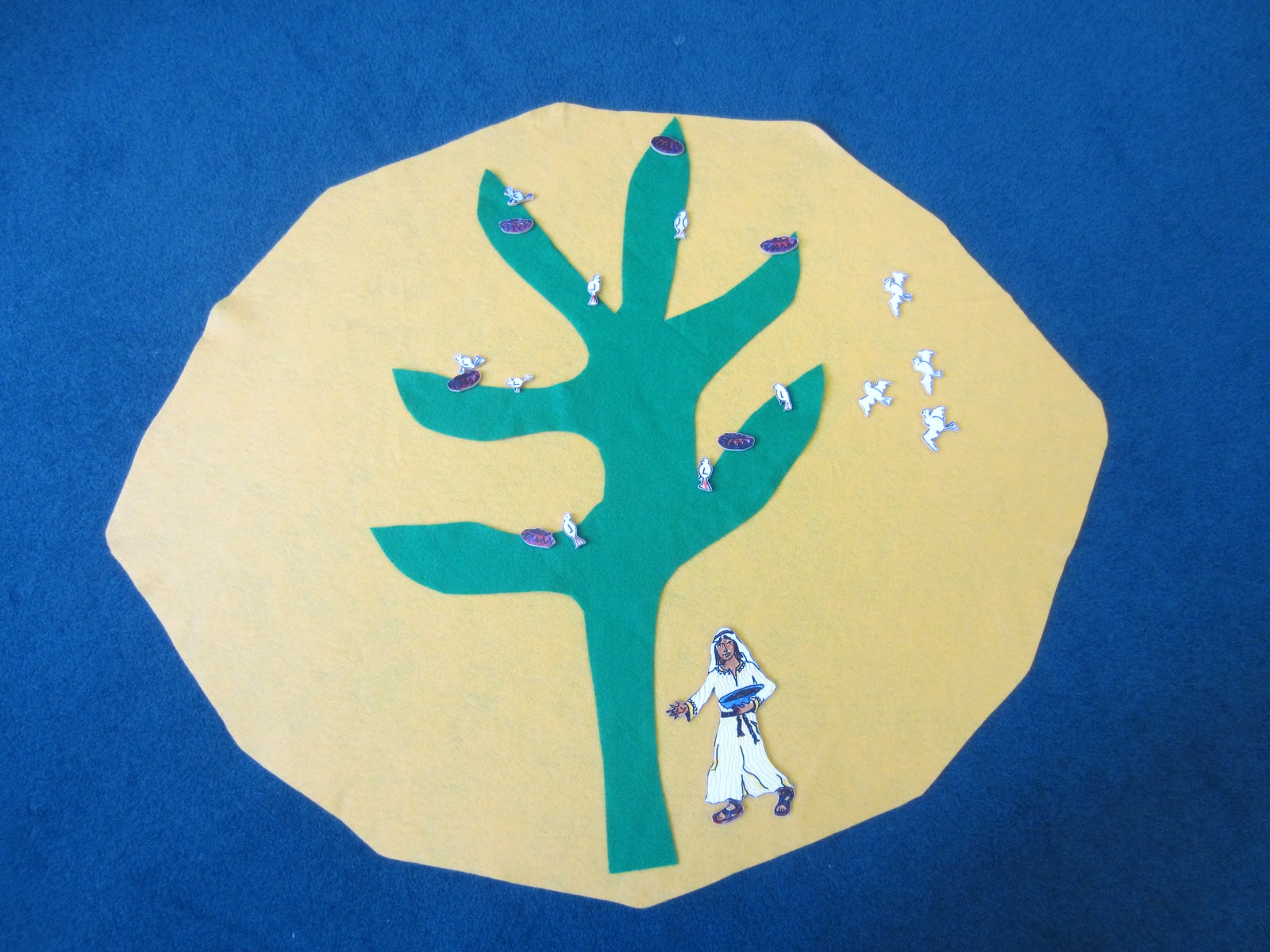 1. How big do they imagine the mustard seed growing? Why not lay out butcher paper on the floor and let the children draw the tree? I’ve seen a class of fours do this, so I know all of ours can do it to. One team of kids could draw and fill in the tree, another do the leaves, another do the birds and birds’ nests, and another do the sower.