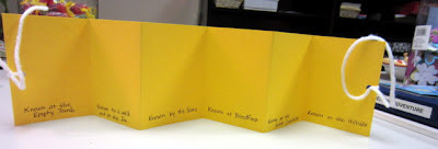 For the example I made here I took 12″ x18″ pieces of construction paper from the paper closet, cut each of them into 3 long strips of 4″x 18″ and folded each accordion-style into 6 sections.