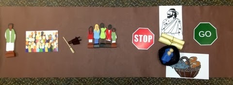 If your Godly Play story baskets are all displayed in your classroom where the children can see them, I’d encourage you to include the part of the script in which you invite the children to gather one by one anything in the room that reminds them of this part of Jesus’s life, put it around the story tile, and share their thoughts about its connection with the story. As you know, the children can be so creative in this and make connections that we might not even think about.