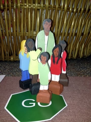 3. Children could draw Jesus in the temple, or draw the temple background and cut a Jesus figure out of paper so that you can move him around the temple. Kids could also cut out Mary and Joseph figures so that they can “enter” the temple and play out the story. Or you could turn a shoebox into a temple scene with clay or clothespin Jesus, Mary, and Joseph figures, in addition to temple leader figures. Or you could have the children just make the figures and let them retell the story using the Godly Play temple we have in our rooms. (Our Mary to the right comes with a question mark, because she’s wondering where Jesus is.)