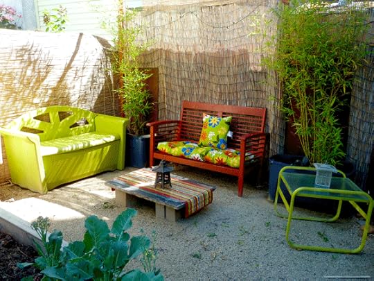 What a simple and gorgeous gathering space! Grass mats hid the drab fence and screened the space from the neighbors. Outdoor furniture was painted bright colors. I’m not sure how much maintenance goes into the pea gravel ground cover, but it looks great.