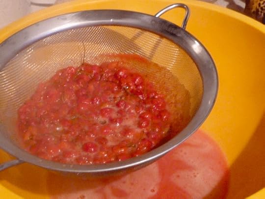 What to do with fifteen pounds of goumi berries? The fruit is said to be low in acid, which makes me nervous about canning it. Instead, I decided to juice the berries and preserve them in the freezer. That way I don’t have to worry about acidity level – just flavor. Here was my process: