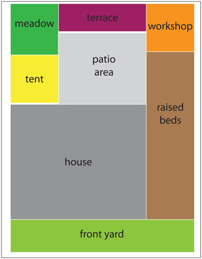 Diagram of the outdoor mini spaces from Danae and Marks’ garden – perfect places for entertaining