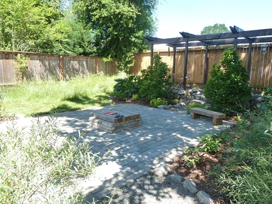 A long driveway was taking up prime real estate in full sun, so they dug it up. The driveway was replaced with raised beds for growing veggies. The bricks were careful re-laid in the backyard to form a large patio with a central fire pit. The patio is surrounded by planting beds to soften the edges. Mark constructed a cover for the fire pit, so it can function as additional seating when not in use.