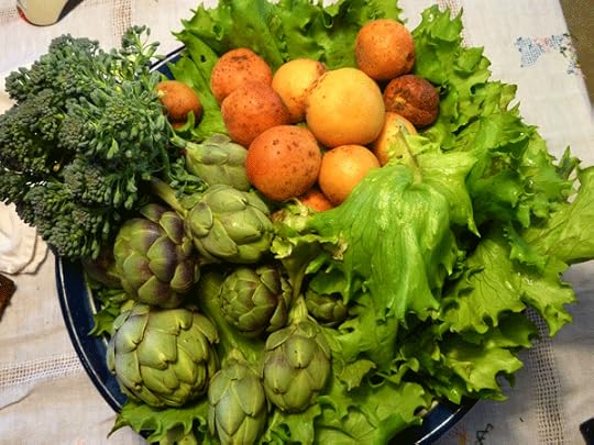 Several delicious veggies filled our plates at mealtime including kale, chard, spinach, lettuces, and piles and piles of artichokes.