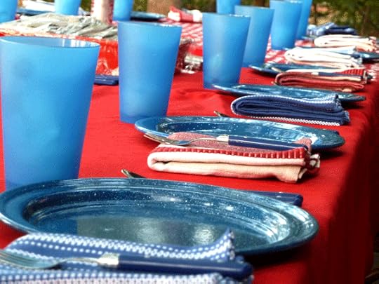 We pulled tables together to make one long enough for us to all gather outside near the lake. If we ever have a cabin of our own, I will insist on having these blue speckled tin plates.