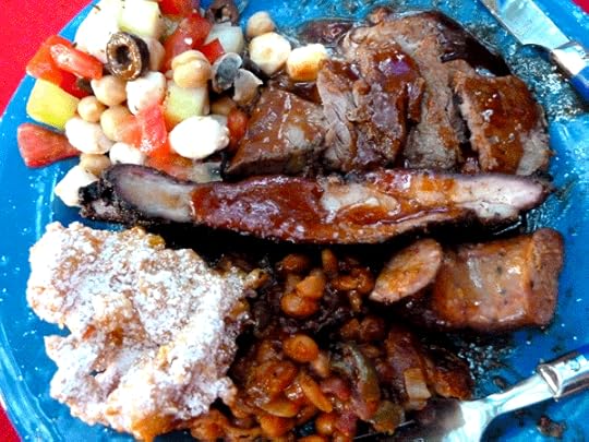 The dinner on the 4th of July was outstanding, as always. It was lovingly prepared by Aunt Emily and her daughters. In clockwise order from the upper left: Greek salad, brisket, pork ribs, pork sausage, baked beans, corn fritters. For dessert: peach cobbler and homemade ice cream.