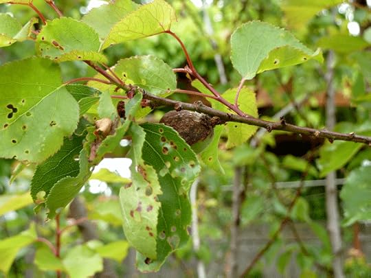 It turns out our lovely little tree has Coryneum Blight – a nasty fungal disease that effects both fruit and foliage. Once blight has found the tree, it will overwinter and continue to re-infect the tree. The best strategy is typically to spray the tree with a copper application or other fungicide in the fall and perhaps again in early spring before it blooms.