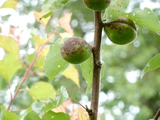 Our Puget Gold apricot was planted three or four years ago and has quickly grown into a lovely tree. About a month ago, it appeared like an insect was bothering the tree. The leaves had little pin holes on them. But then I noticed the fruit was looking funny as it ripen on the tree.