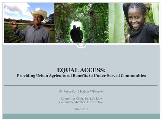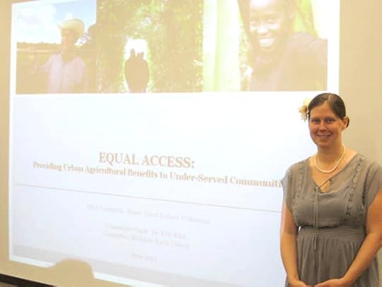 My thesis is titled Equal Access: Providing Urban Agricultural Benefits to Under-Served Communities. It will be available through interlibrary loan, so even if you attend another school you can still borrow my thesis from your library. It will also be available soon through Google Scholar. In addition, I am posting the thesis in its entirety through the link above for people to easily access. It combines my interest in urban farming with my desire to help under-served communities.