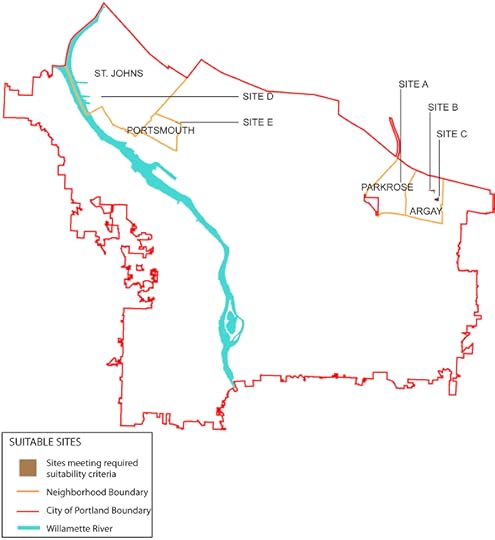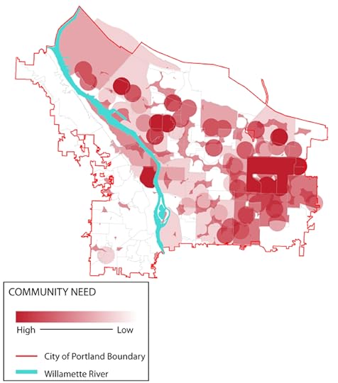 I used a program called GIS to map where under-served communities live in Portland. The areas at highest risk of food insecurity, childhood obesity and poor community cohesion were the areas most in need of increased access to an urban farm (shown above).