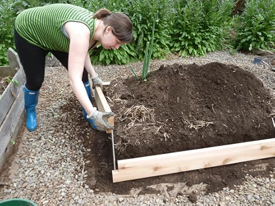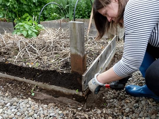 Our challenge was installing these slick new beds to an already planted out garden. We began by carefully removing the old, beat up fence boards. The new beds were a few inches smaller than our old ones, so we also had to trim the soil edges back a bit to fit the new beds around them.