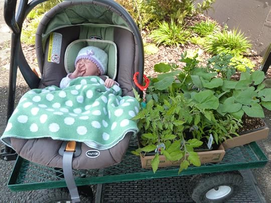 She has also accompanied me on many trips to the nursery to get the garden jump started this season. I enjoy poking through the varieties of tomatoes while she enjoys munching on her hand – a new discovery for her.