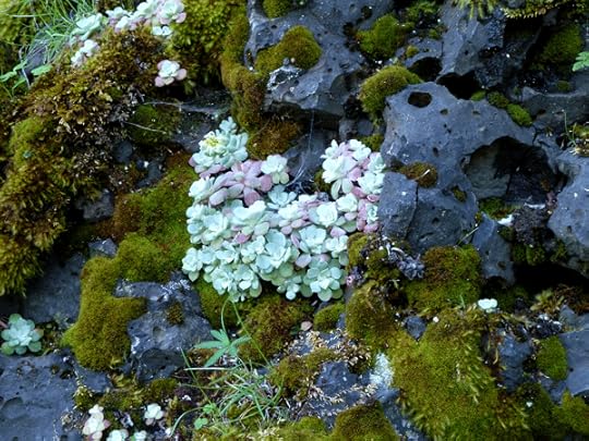 As the elevation increases, the landscape shifts to a rocky, basalt area. There are gorgeous succulents growing in the crevices of the rock, should you slow down enough to look. An almost shrine-like bench is carved into the rock next to the trail – our family’s regular photo spot.