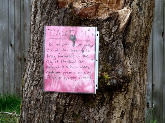 We have a large snag next to our house along an unimproved road. It’s a Bigleaf Maple, a native tree, and we left it there for years because it wasn’t causing any harm. One recent spring day there was a light wind – nothing real strong – and half the tree fell, no longer able to support its own weight. Luckily, it fell away from the house and no one got hurt. That left the other half standing, which is the half that leans toward our house.