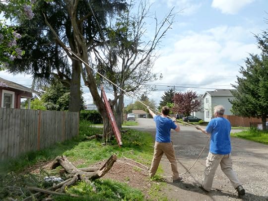 They made cuts halfway through the limbs leaning over the house, threw ropes around the branches, and tugged them off from below. It worked pretty well. The biggest branches closest to the house came cleanly off. Just a few more branches to go and we could safely pull the whole trunk over, away from the house.