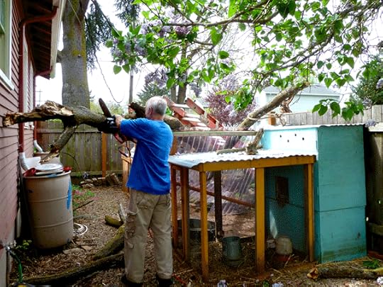 A couple hours later, the snag was cut for firewood. The fence was repaired. The duck coop frame was fixed. Beers were distributed. A couple days later, the plastic roofing was replaced on the duck coop.