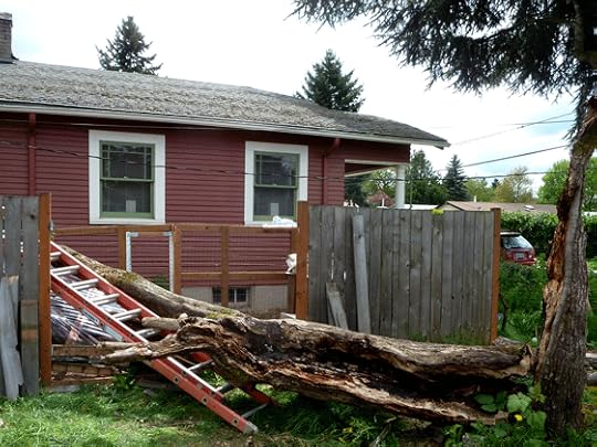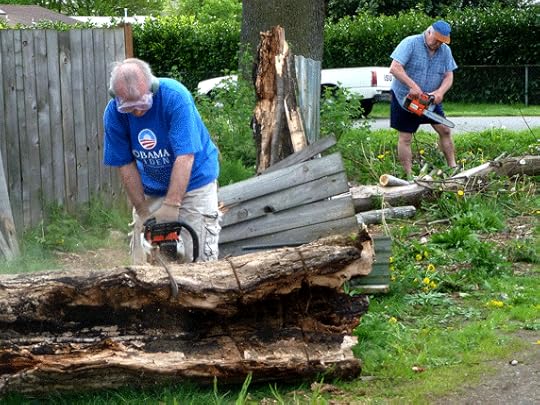 Like moths to a flame, the neighbors appeared. Some came to gawk, but most came to help. Stefan offered to saw the wood and take away to heat his home. Randy brought over his tools and spare plastic roofing. Dan came down the road with more tools and spare lumber. I went to the lumber yard to get more fence boards.