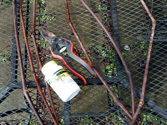 Next, I dipped the ends into water and then dusted them with rooting hormone. I picked spots around the garden against the fence where I would like to eventually trellis the vines, then essentially shoved the vine cuttings in the ground and hoped for the best.