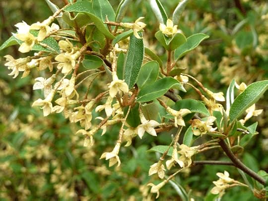 We have two varieties of goumi bushes – one tastes sweet and the other a bit tart. They are both exploding with blossoms and fruit heavily each season. If you look just below the flowers, you can see a place where the brown stems bulge. I think those may be the early berries.