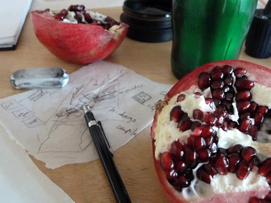 Thanksgiving falls at a weird time in my graduate school schedule. It's always the week before our final studio design review, so I'm cranking on drawings when most people are pouring over holiday recipes. The picture below is the world I live in right now: sketches, trace paper, tea and pomegranates (a little treat to keep me in my seat working).